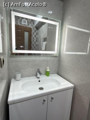 Baia mare a apartamentului este dotată cu cadă (cu paravan de sticlă care protejează contra stropilor), chiuvetă cu oglindă mare montată deasupra unui dulăpior de baie încăpător, cu mai multe sertare, toaletă, maşină de spălat rufe, calorifer port-prosop. Are aspectul unei băi de hotel de patru stele! Ceva depuneri de calcar, observate de ochiul meu de soacră în devenire, pe la cadă... Uscătorul de păr (de bună calitate), l-am găsit într-un sertar. Am avut o rezervă mai mult decât suficientă de hârtie igienică şi flacoane mari cu săpun lichid, şampon şi gel de duş, plăcut mirositoare.