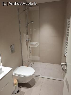 Baia camerei este modernă și bine întreținută, cu finisaje elegante și curate. Dispune de duș spațios, cu cabină din sticlă, chiuvetă cu oglindă, iluminată plăcut și vas wc. Săpunul și uscătorul de păr completează dotările.