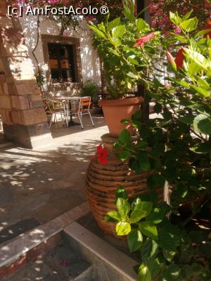 O cazare pe gustul meu, tipic grecească, cu o grădină cu flori și verdeață din plin în Dodecaneze. Cu un mic balconaș, cu vedere la mare, cum să nu-ți placă?!