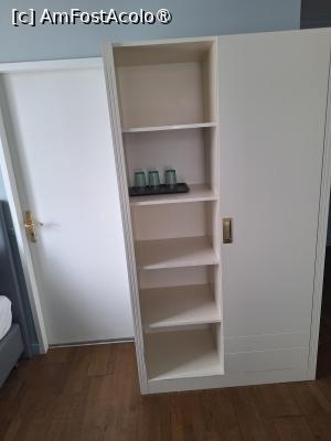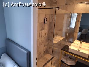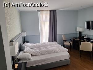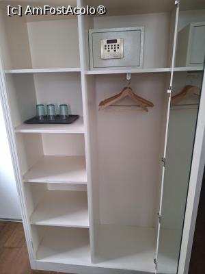Desi mai mica fata de prima varianta, camera 32 are dimensiuni generoase. Camera avea un pat dublu si un pat simplu, ambele cu saltele si lenjerie de buna calitate. Mai exista un birou cu doua scaune, fara racitor, pe care se aflau o cana electrica si plicuri de ness si ceai. Pe un perete exista si un televizor, pe care nu l-am folosit. Pe un perete se afla dulapul, alcatuit din doua parti una cu umerase (unde se afla si un seif) si una deschisa cu rafturi. Daca ar fi sa gasesc un neajuns, ar fi ca usa de la baie se deschidea chiar langa patul de o persoana. Baia era dotata cu dus modern de tip walk in, existand dispensere cu gel atat la ghiuveta cat si in cabina de dus. Camera noastra avea si un mic balcon.