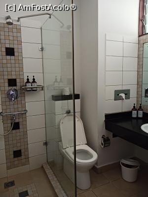 La dus erau doua flacoane mari cu pompa; unul cu sampon celalalt cu gel de dus. Pe chiuveta, un sapun lichid si un lapte de corp hidratant ambele in acelas format ca si samponul.