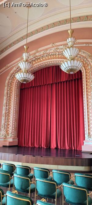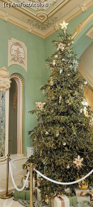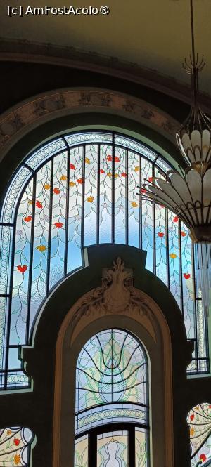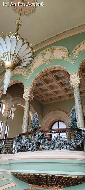 După verificarea biletelor ajungem în alt hol mare, loc de unde se despart direcțiile de vizitare: sălile de la parter, accesul spre etaj ori spre subsol; în acest hol se află o garderobă, iar la subsol toalete. Bradul de sărbători, simplu și elegant, însuflețește spațiul din apropierea scării monumentale. Marmura, stucaturile, feroneria, tâmplăriadin lemn, vitraliile, pardoseli din piatră, ornamente murale, candelabrele – toate elementele artistice au fost restaurate sau refăcute conform cu originalul sau cu stilul arhitectural. Mulțimea de vizitatori se străduie să realizeze fotografii cât mai reușite pe scară și în balconul sub formă de scoică, între pilaștrii de marmură verzuie, lângă vitralii – este hărmălaie, se așteaptă pentru unghiul perfect, se bombăne... hi, hi.