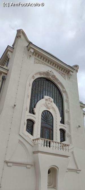 Admirăm arhitectura exterioară în stil Art Noveau creată de arhitectul francez D. Renard, în detrimentul celei tradiționale românești propuse de arhitectul Petre Antonescu, la care s-a renunțat după începerea lucrărilor. Ajunși în fața celebrului „vitraliu în evantai” ne hotărâm să vizităm și interiorul, deși unii vizitatori care părăseau clădirea bombăneau nemulțumiți de ceea ce au văzut, comparativ cu prețul plătit. Remarcăm terasa fațadei sprijinită pe un portic larg, dar și partea superioară a clădirii, decorată cu elemente arhitecturale de forma navelor antice (rostrale), cu capete de berbec și ghirlande de alge marine.