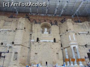 Scena lunga de 61 m are un perete special decorat, cu coloane, frize, nișe cu mozaicuri din marmura colorata, statui. În nișa centrala se afla statuia imperatorului Augustus inalta de 3,5 m în tinuta imperiala cu mâna dreapta ridicata în sus si toga bogata cazând în falduri de pe umeri. Se presupune ca ar fi reprezentarea imperatorului în chip de zeu al artelor si muzicii, Apollo.