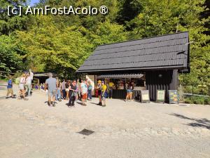 Cu puțin înainte ca traseul de vizitare să se finalizeze, apele Radovei se prăbușesc deodată într-o cascadă nu foarte înaltă, dar frumușică. Inițial am crezut că asta e cascada despre care citisem, însă nu, nu e; pe aceea aveam s-o descoperim un pic mai încolo. Ultima punte de lemn se desface într-o platformă spațioasă, care e practic terasa unei cafenele-bistro. Majoritatea meselor erau ocupate, altfel poate ne-am fi lipit și noi, cred că ar fi fost drăguț să gustărim ceva sub razele blânde, în acel decor de poveste. Am depus în niște coșuri speciale căștile și audioghidurile și am decis să nu mai zăbovim, să alegem unul dintre traseele de întoarcere.