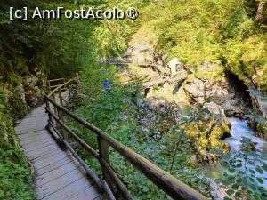 Precum am amintit, traseul constă într-o succesiune de punți de lemn prevăzute cu balustrade solide, unele fixate de pereții stâncoși, altele traversând ici-colo râul. Se urcă sau se coboară câteva trepte la trecerea de la o punte la alta, nimic de speriat. Aș aprecia că e un traseu ușor, pretabil pentru orice condiție fizică și, desigur, extrem de spectaculos. E ca o plutire prin natura virgină, printre stânci semețe, printre copaci înfrunziți și flori delicate de munte, acompaniată în permanență de murmurul râului cu ape turcoaz-verzulii, în care se zbenguie păstrăvi. Noi am nimerit o zi frumoasă de vară și a fost perfect așa pentru că citisem că în perioadele mai umede se poate aluneca pe anumite porțiuni, unde lemnul s-a lustruit. Desemenea am citit că e frumos să vizitezi canionul și dimineața devreme, când e mai puțin aglomerat și când fuioare de ceață se ridică în văzduh din apa rece, creând o atmosferă magică. În fine, magic mi s-a părut oricum și nici prea mare aglomerație n-am prins...