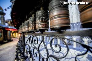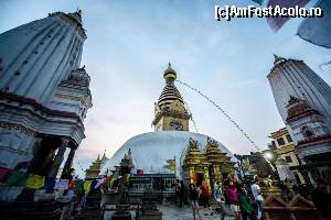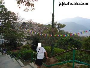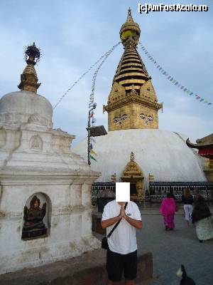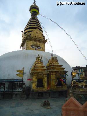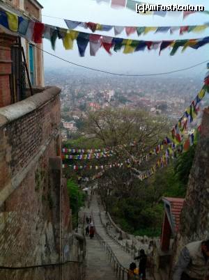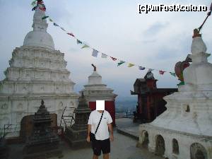 Trebuie sa admit ca mersul in jurul stupei si invartitul mosorelelor aduce dupa sine o mare liniste si pace interioara. Deasupra stupei flutura mii de stegulete de rugaciune tibetane, colorate in cinci culori reprezentand cele 5 elemente. De cate ori bate vantul steguletele inalta rugaciunile scrise pe ele catre Buddha. Experienta de acolo mi-a ramas adanc intiparita in minte. Batea un vanticel cald, steguletele colorate fluturau, cineva tragea un clopot, lumea se invartea si impingea mosorelele iar in apropiere se auzea muzica dulce a petrecerii, toate astea deasupra orasului plin de luminite si sub un cer superb, violet, pe care apareau primele stele. Am stat acolo pe zidurile care inconjoara stupa si am admirat privelistea apusului de soare peste oras, am privit stelele rasarind una cate una, am respirat aerul violet incarcat cu liniste, am ascultat cu ochii inchisi rugaciunile si incantatiile calugarilor buddhisti pana la ora inchiderii cand am fost poftiti foarte politicos si umil (parca isi cereau scuze cu mainile impreunate), sa plecam ca sa poata hrani maimutele si sa poata inchide templul. Cu parere de rau si cu un gol in suflet am plecat de acolo urmariti de cohorte de maimute care curgeau din toti copacii si ieseau din toate scorburile alergand intr-o directie numai de ele cunoscuta, spre locul unde erau hranite de catre calugari.