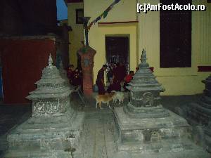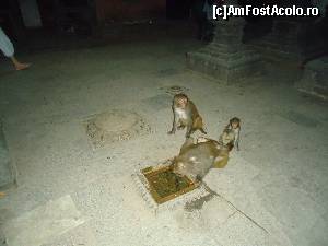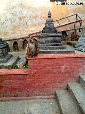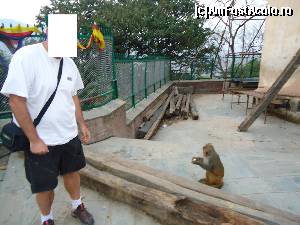 La stupa obiceiul credinciosilor este sa o inconjoare in sensul acelor de ceasornic si sa invarteasca toate mosorelele continand incantatii si mantre, tot in sensul acelor de ceasornic. Noi am ajuns acolo la ceas de seara si tocmai era in desfasurare o frumoasa petrecere cu muzica si dans. Am cumparat bineinteles si banane pentru maimute si am oferit una unei maimute care se uita cam ciudat. Imediat mi-a smuls banana din mana si mi-a ars o palma! Am sarit inapoi un pas surprinsa de agresivitatea patrupedei paroase si m-a pufnit rasul. Cand a vazut ca rad de ea mi-a aratat ghearele ascutite si m-a scuipat. Poftim rasplata! Cam suparata pe nebuna aia de maimuta am vazut un puiut mic si cumintel. Am zis sa incerc si cu el schema si i-am oferit o banana. Doar cat am intins mana spre el cu banana ca m-au si inconjurat vreo 4 masculi nervosi care ma scuipau si ma amenintau din toate partile. Am vazut colti ranjiti, gheare scoase din pumnii stransi si am auzit multe sunete care aduceau bine cu injuraturile de la usa cortului. Am decis sa nu mai incerc nimic in privinta lor si m-am indreptat catre stupa alba ca sa ma linistesc.