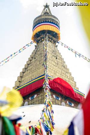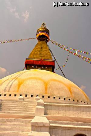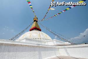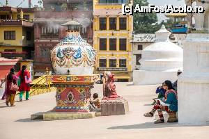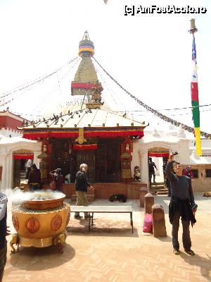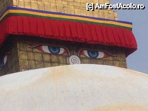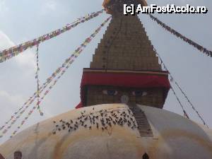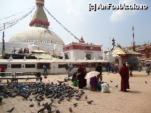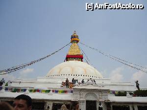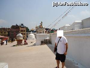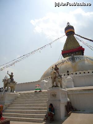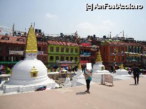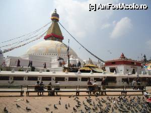 Cea mai mare stupa buddhista din Nepal, si una dintre cele mai importante din lume, un loc in care orice Buddhist trebuie sa vina macar o data in viata. Aceasta stupa este chiar in inima agitata a orasului si trebuie sa faci balet cu autobuzul printre mii de scutere si masini ca sa o poti vedea. Pe o mica straduta ornata cu magazine de suveniruri pe ambele parti se patrunde spre o alta lume, o minune alba cu acoperis auriu si tuguiat, de pe care te privesc impaciuitor si protector minunatii ochi al lui Buddha. In jurul stupei exista multe magazine cu suveniruri de tip mandale, mosorele cu incantatii, obiecte de cult, stegulete tibetane, matanii tibetane, muzica pentru meditatie, etc dar e bine ca nu circila masini sit e poti roti in voie in jurul ei. Tot in jurul stupei exista si o manastire tibetana, un fel de refugiu pentru calugarii din Tibet. Negativi si obiditi cu am ajuns noi acolo in urma vizitei la Pashupatinath, am dat cu totii, parca intelesi intre noi, ocol stupei si am rotit de toate mosorelele. In fata intrarii care ducea la treptele pe care puteai urca sa dai ocol de la un nivel mai inalt, ardeau intr-o oala enorma niste ierburi, cred ca marijuana, care raspandeau un fum placut si purificator.