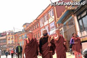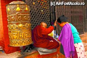 Erau multi calugari buddhisti in zona, asezati in pozitie de meditatie sau hranind porumbeii din piata. Unul dinre ei mi-a dat binecuvantarea lui si imediat am scapat ca prin farmec de blestemul de la ruguri…m-am simtit usoara si am pornit din nou la inconjurat stupa. Cand mi-a trecut bine senzatia aia neplacuta am aruncat ochii roata si am vazut un templu mare din lemn unde se afla un mosor de incantatii enorm, mult mai mare decat un om, si frumos colorat. Am vrut sa intru dar am auzit muzica si am vazut multimea inghesuita ca la urs. Se turna o scena de film Bollywoodian. O mandra canta si miorlaia de rupea pe langa marele mosor, spre marea mea ciuda ca nu pot face poze cu mosorul. Ei as! Am bagat o mana cu camera printre niste zabrele si i-am tras un blitz in ochi tocmai cand suferea mai tare in cantec! Nu sunt sigura dar cred ca m-au injurat cameramanii! M-am carat eu mai incolo cu camera mea cu tot si ce sa vezi, pe un piedestal se afla un clopot gigantic impodobit cu tot felul de scrieri pe care mi-am dorit mult sa il fotografiez. Na, ma mananca si pe mine ce sa fac?! Atat ca langa el suferea in tacere si se schimonosea (dupa model Bollywood) un bade, inconjurat de o gloata de gura-casca si de niste meseriasi care tineau umbrele albe care sa il lumineze pe suferind in timp ce miorlaie. Eu plina de obida ii transmiteam ganduri negative menite sa inceteze cu sclifoselile ca sa pot trage in poza clopotul buclucas. El nimic! Doar ca binecuvantarea calugarului buddhist isi facea efectul si iata ca din multime iese un sherpa nevinovat care cara cu capul un enorm balot (cand spun enorm inseamna mai mare decat sherpa cu pricina) si care neavand pe unde sa traverseze piata din pricina gloatei pestrite de gura-casca, apuca fix prin spatele badelui cantaret-suferind-miorlaitor, dar fix cand acesta se tinea cu mana de inima bolnava de dragoste si chin si probabil dor. Nu puteti sa va imaginati ce hohote au izbucnit in toata piata pentru ca badea-suferindul nu l-a vazut pe sherpa si continua sa sufere cu mana pe inima, iar sherpa nu l-a vazut pe bade din pricina clopotului enorm si s-a oprit in cadru ca sa vada de ce rade lumea. Ne-am tavalit pe jos de ras. Iar cameramanii l-au pus pe bade sa sufere toata povestea din nou.