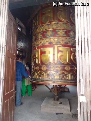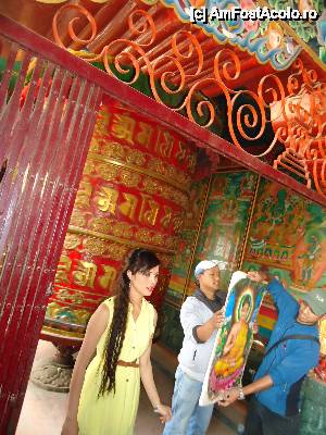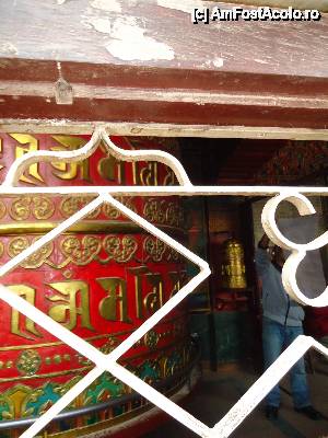 Vezi aici in poze niste mosoare gigantice, astea colorate unde canta gagica aia. Si alea tot asa trebuiesc impinse si ele incep sa se roteasca. Pe ele sunt scrise mantre, rugaciuni, care se ridica catre cer cand tu le rotesti, na!