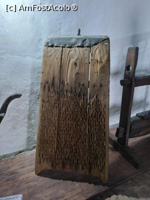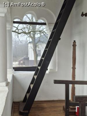 Am urcat pe scara de lemn masiv la primul etaj cu două camere și expoziția „Ocupații tradiționale oltenești” unde am văzut un dispozitiv tradițional de tors fir de borangic și primul clopot al şcolii. Sălile aveau tavane cu grinzi solide de lemn. Peste tot erau stâlpii protectori ai casei de răul nevăzut.