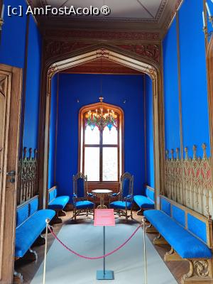 Salon cu pereții acoperiți cu mătase roșie, tavanul din lemn sculptat, cu medalioane pictate, cu un mare candelabru este elegant, rafinat. Ferestrele înalte, cu vitralii colorate în partea superioară filtrează lumina creând o atmosferă caldă, deconectantă, iar Mobilierul, Scaunele înalte, tip tron, cu tapițerie roșie asortată pereților, Masa rotundă, chiar și cele două Fotolii folosite de regele Oscar I și regina Joséphine când își primeau oaspeții, creează un cadru intim, deschis. Tot aici erau un pian, un șemineu și o mare oglindă.
