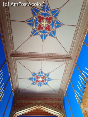 Intrând în Palat ne-am oprit în Vestibulul vopsit într-un puternic albastru ultramarin și luminat prin vitraliile unei fereastre. Camera este împărțită în trei părți prin două arcade, tavanul din lemn sculptat are medalioane pictate. Partea inferioară a pereților este acoperită cu panouri, care par sculptate în lemn, deși sunt turnate în ciment și vopsite în nuanțe care imită stejarul și mesteacănul. Mobilierul, două fotolii și o măsuță cu blat de marmură și corpurile de iluminat.