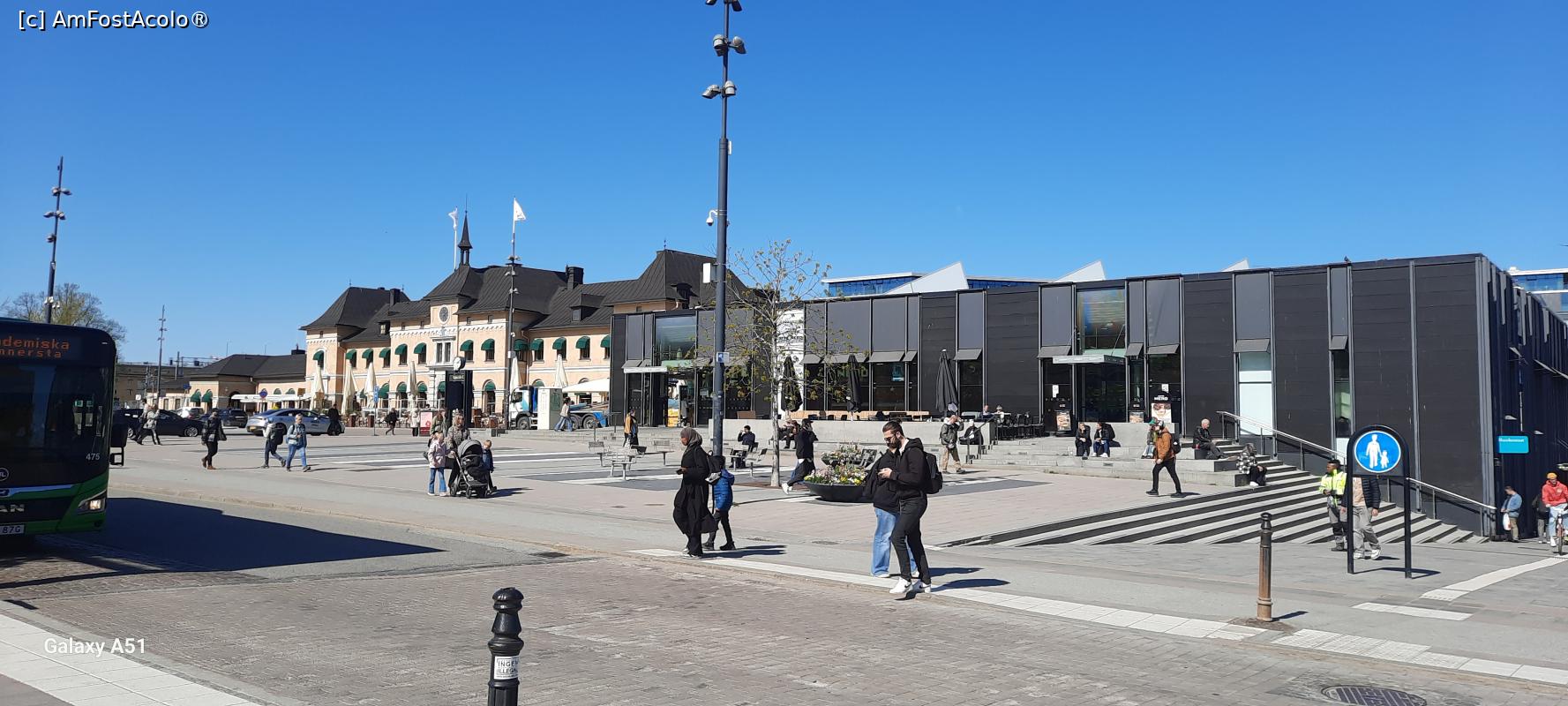 În Uppsala, vezi impresii în care am spus câte ceva despre oraș, sosind cu trenul din Stockholm am coborât în Gara Centrală, cunoscută mai bine sub numită de Uppsala C. Am început explorarea orașului cu Gara, modernă, cu automate și informații pe displayuri. Are „cea mai mare Parcare de biciclete din Suedia” cunoscutul Garaj de biciclete - Cykelgarage. Amenajată în Centrul de Transport - Resecentrum construit în stil minimalist actual, Fațadă neagră, Geamuri verticale pus în funcțiune în 2011, Gara mai este numită și Gara Nouă - Nya Station spre a o deosebi de Vechea Gară - Gamla Station, clădire stil renascentist olandez construită în 1866 cu Turn cu ceas. Astăzi este Complexul Gara cu Braseria Paris, Cafeneaua Roma și Barul Londra.