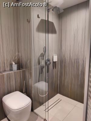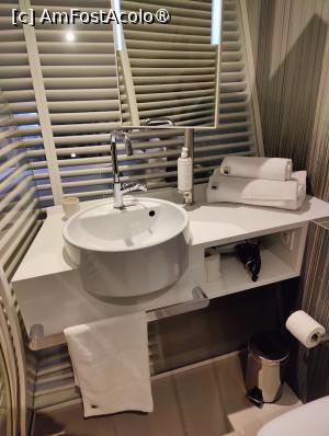 Baia... e ciudată tare, nici nu știu cum s-o descriu, o să vedeți în poze! Pe dinafară e ciudată, că pe dinăuntru conține tot ce trebuie: chiuvetă, WC, cabină de duș, plus consumabile de tot felul și prosoape curate, în mai multe dimensiuni. Încăperea e un... corp geometric nedefinit ce ocupă unul dintre colțurile studioului, alcătuit din sticlă dublată de un fel de șipculițe transversale dispuse orizontal. Nu știu dacă ați priceput ceva; nu vă bateți capul, o să pun poze, v-am zis. În concluzie, e genul de hotel în care nu prea merge să te cazezi cu colegul de muncă, ci cel mult cu colegul de cameră. Dacă mă-nțelegeți ce vreau să zic...