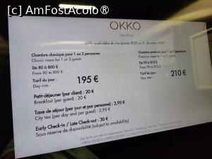 Oferă 2 tipuri de camere, diferența de preț era mică, așa că am ales-o pe cea „premium” în detrimentul celei „clasice” . Suprafața e aceeași, 18mp, par a fi decorate și dotate asemănător (conform pozelor), cred că diferența este dată de etajul la care sunt amplasate. Am antamat-o așadar pentru 2 nopți și prețul de 369 euro, la care se vor fi adăugat taxe suplimentare: cea de oraș (2,95 euro/pers/noapte), de parcare (21 euro/zi) și, opțional, de mic dejun (20 euro/pers/zi). Franța, deh!
