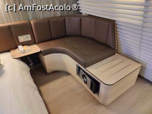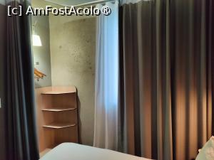 Vis a vis de pat se află deasemenea mobilier modular minimalist: o masă cu scaun, un fel de blat îngust pe care se sprijină TV-ul și 2 dulăpioare pe care inițial le-am ignorat, pentru ca mai apoi să descoperim că adăpostesc setul de preparat ceai/cafea cu toate accesoriile necesare. În colțul dinspre fereastră, în spatele unei draperii – zona de depozitare, cu 3 rafturi suprapuse și câteva umerașe agățate.