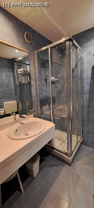 Din holul de la intrarea în cameră, pe stânga aveam baia, o incintă foarte spațioasă comparativ cu camera, în care se regăseau: cabina de duș, chiuveta cu oglindă și blat, vasul WC, bideul, rafturi utile. Totul strălucea de curățenie, ca și în cameră de altfel. Consumabile am primit din plin: hârtie igienică, gel de duș la flaconașe, săpun tip turist, discuri demachiante, cască de baie. Aici am avut o curiozitate și am privit spre dușul care avea doar cap fix, cu flux de sus, deci casca era obligatorie. Cabina era extrem de mică, trebuie să fii fit pentru a încăpea în interior.