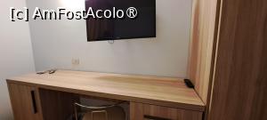 Camera arăta exact cum este ilustrată pe website-ul propriu sau pe booking.com: spațioasă, curată, mobilată modern, dar auster, după părerea mea. Patul matrimonial format din două single lipite ocupa aproape toată camera, două noptiere simple îl delimitau la capete, vizavi era situat un birou cu scaun și sertare deasupra căruia era suspendat TV-ul cu diagonală ok. Într-o parte a biroului se afla minibarul care avea câteva produse ale căror prețuri (deloc exagerate) se găseau pe o listă așezată deasupra.
