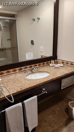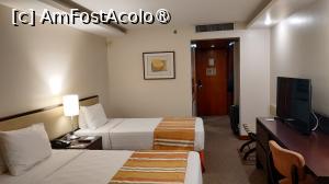 De la recepție am primit camera destul de repede, aceasta fiind situată la etajul 18. Prima impresie, în momentul în care am deschis ușa, a fost una pozitivă. Camera dublă standard era spațioasă, de aproximativ 25 mp, perfectă pentru tranzit și nu numai.