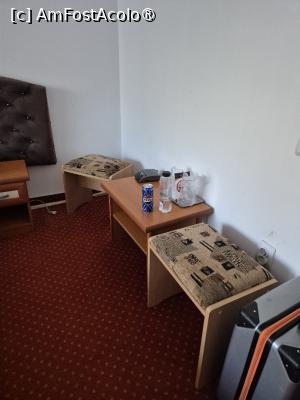 Mai găsim în cameră un birou pe care se află televizorul, un scaun, o măsuță mică și două scăunele.