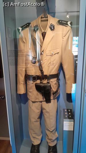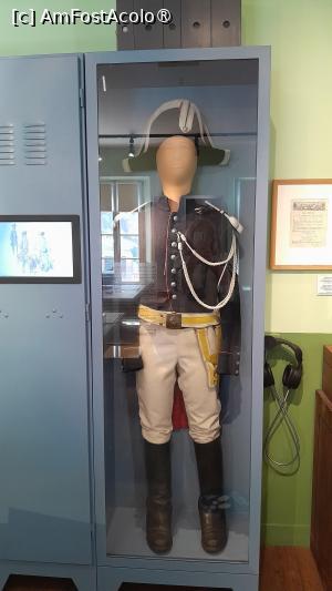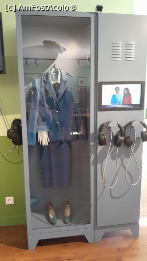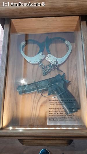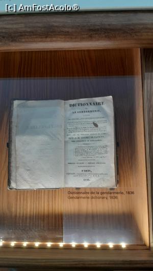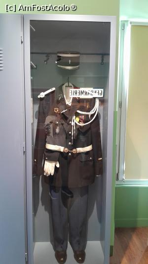 La perete sunt dulapuri vitrina cu evolutia costumelor de jandarm si a caschetelor purtate si diverse obiecte din activitatea zilnica a unei sectii de jandarmi.