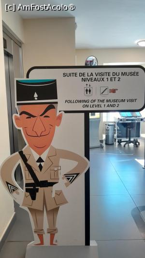 Este expusa si o motocicleta folosita de jandarmerie si costumul Maicii ce apare în comediile cu jandarmii. O masina decupata pe o parte ofera ocazia de a face fotografii cu capul scos prin trapa, asa ca în film. Un Citroen vechi cu parbrizul înlocuit cu un ecran pe care ruleaza secvente din filmele cu jandarmi, mai încolo o statuie din bronz a lui Louis de Funés îmbracat în costum de jandarm si cu cascheta în mâna în marime naturala prilej sa-ti faci poze, toate doamnele ce treceau pe acolo se fotografiau cu statuia jandarmului.