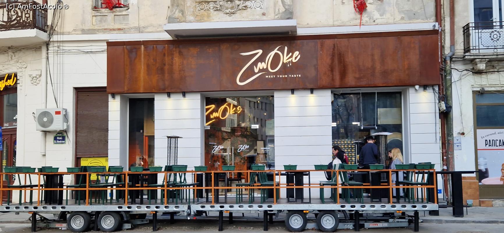 Zmoke, după cum îi spune și numele, este un restaurant ce oferă preparate din carne de toate felurile gătite la smoker, cu diferite arome. Pe mese și în restaurant se află un cod QR, pe care – dacă-l scanezi - afli că aici poți mânca următoarele feluri: Meat zmoke, Grill, Pizza, Fresh pasta, Burgers, Rolls meat, Sandwiches, Salad, Garnish, Topping, Soup, Dessert.