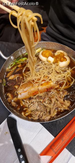 Soțul prietenei mele a ales - din categoria „Soup” - „Liquid Taste Zmoke” , un fel de ramen din carne de porc, tăiței cu ou, legume fresh, soia, mix de condimente, fasole neagră murată, ridiche (43 lei);