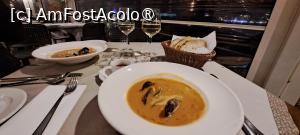 Am ales să comandăm două ciorbe de pește cu fructe de mare și două porții de calamari prăjiți. De băut, am vrut neapărat vin alb sec pentru a face să alunece mai bine fostele vietăți ale mării transformate în bucate gustoase, așa că ne-am orientat la două pahare de vin alb, sec.