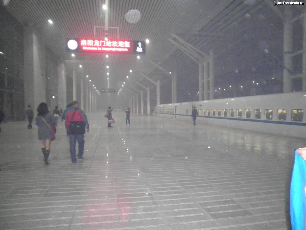 am sa mai adaug la acest rw. -Grotele Longmen, realizat in 400 ani, este considerat, cel mai mare tezaur sculptural din pesteri, din China, si reprezentarile se desfasoara pe toata inaltimea muntelui, iar accesul pe inaltime iti e asigurat, de o scara metalica, cu intreruperi, pe mai multe nivele, fiecare nivel iti asigura, vederea intregii sculpturi. In partea de jos, statuile sunt de marimi mai mici, la ultimul nivel, este reprezentata cea mai mare statuie a lui Buddha. Am sa mai atasez si cateva poze, pe care le-am omis, cu interiorul trenului, pe linie magnetica, si viteza atinsa pe parcurs, intre statii