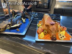 Dacă în fotografiile cu mâncare am deslușit ce feluri sunt, în P48 m-am blocat: în dreapta pozei este un porc, dar nu-mi dau seama ce este în partea stângă, așezat pe un pat (de ghiață