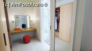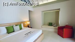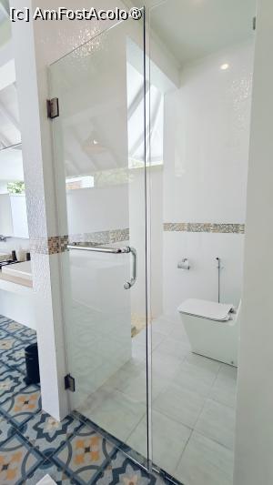 Interiorul vilei era luminos și aerisit, cu tavan înalt și grinzi albe care amplificau senzația de spațiu. Patul matrimonial generos, fotoliul roșu care adăuga o notă de culoare, minibarul și televizorul cu ecran plat contribuiau la confortul modern, dar fără a diminua farmecul natural al locului. Poate doar mobilierul era mai uzat, dar nu m-a deranjat. Baia ne-a impresionat în mod special. Spațioasă, semi-deschisă și foarte practică, dotată cu o cadă, două dușuri separate, două lavoare, iar gresia decorativă în nuanțe alb-albastru se potrivea cu peisajul exotic. Lumina naturală și zona de relaxare exterioară transformau baia într-un mic spa privat.
