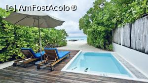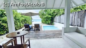 Vila noastră cu piscină avea în jur de 90 mp, iar senzația a fost că am ajuns într-un mic refugiu ascuns printre palmieri. În fața vilei ne aștepta o terasă din lemn, amenajată cu două șezlonguri confortabile, sub o umbrelă, o măsuță cu două scaune, o canapea, iar în imediata apropiere se afla piscina privată – nu foarte mare, dar perfectă pentru momentele de răcorire în intimitate. Întregul spațiu exterior era separat de celelalte vile printr-un gard natural de vegetație luxuriantă, astfel încât aveai senzația că te afli într-o oază doar a ta. Acoperișul în stil maldivian completa atmosfera exotică.