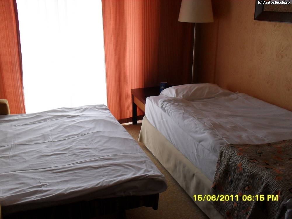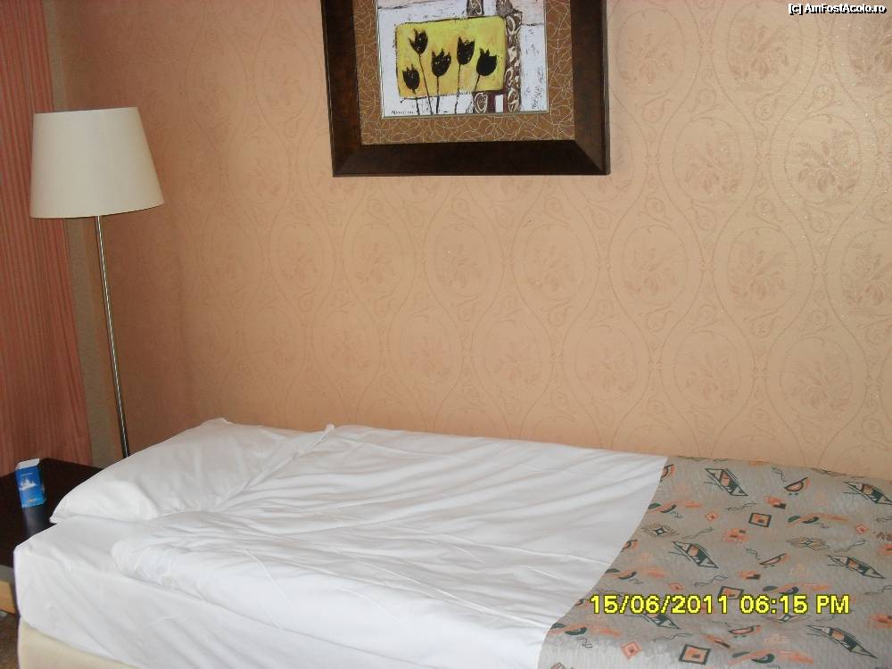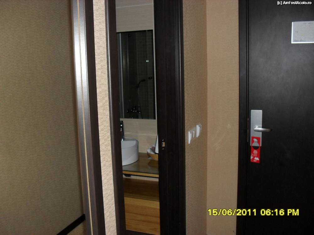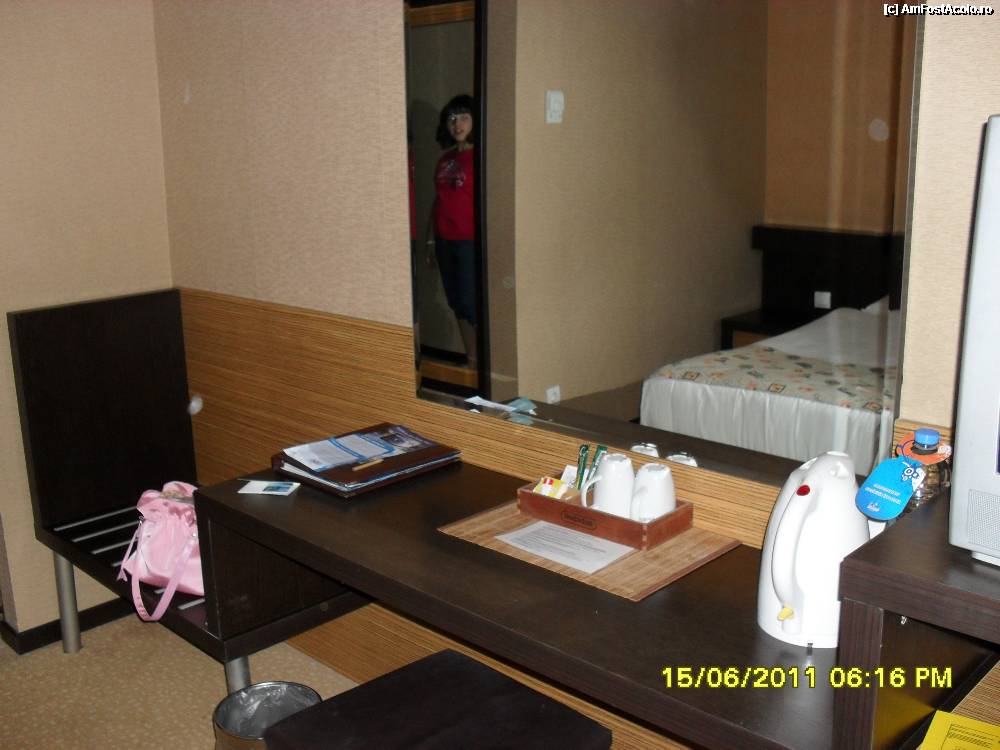 [P10] prima camera, cea mare, in fata patului este oglinda, masuta cu taburet, un TV, dedesupt este minibarul,am avut zilnic plicuri ness, zahar,ceai, o sticla de apa plata, gratuit, si fierbator de apa