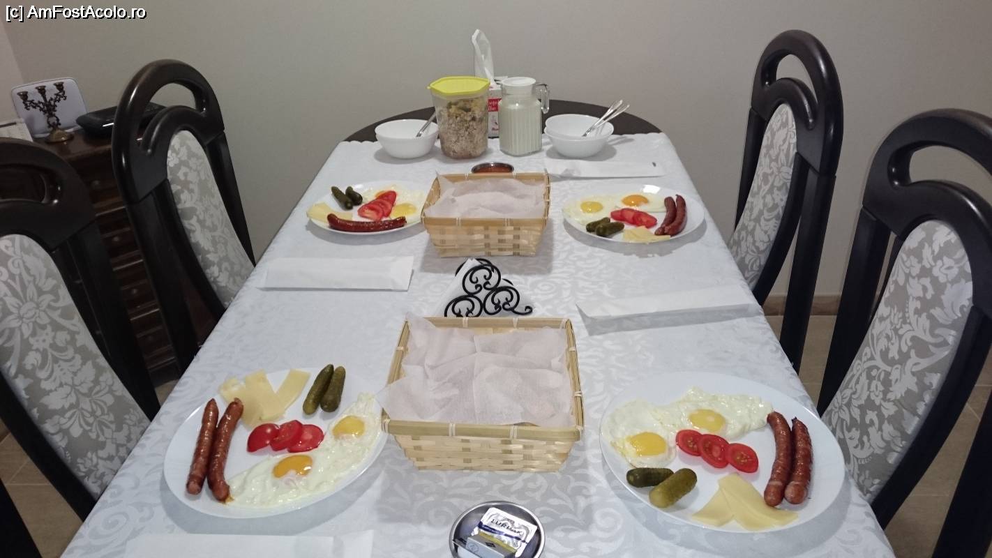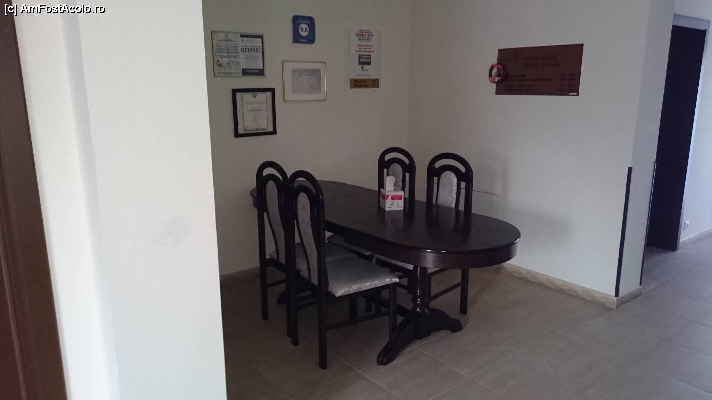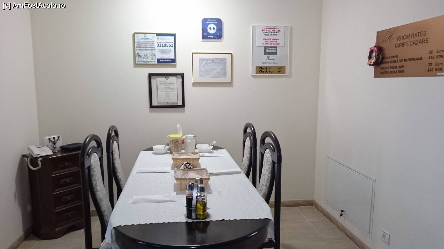 [P06] Masa unde am luat micul dejun, iar pe pereți toate acreditările pensiunii și nota de pe booking.