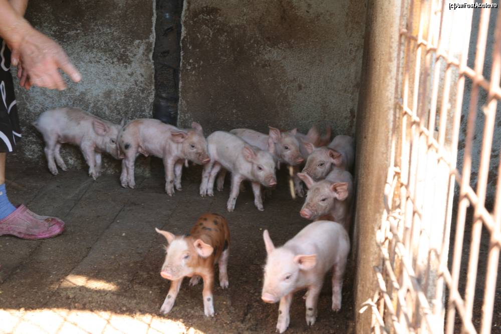 [P06] Tatal purcelusior are cercelusi la gat - acea protuberanta cilindrica ce se vede atarnand pe langa troaca (in engleza ar fi "wattle" sau "dewlap"). Porcul din imagine are 2 astfel de protuberante, dar a doua nu se vede. O parte din purcelusi au mostenit cercelusii :)