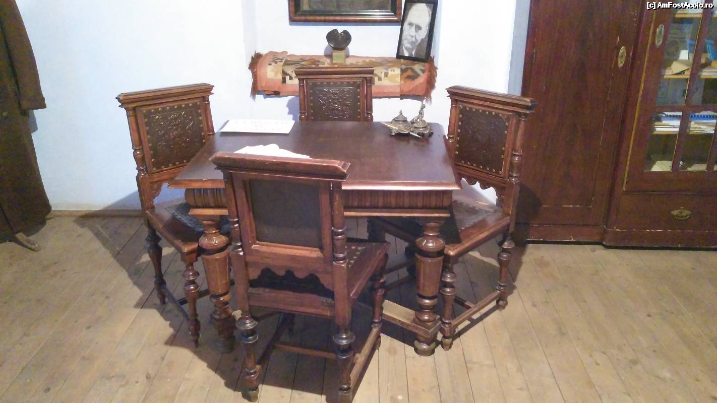 [P16] Casa Memorială Lucian Blaga - piesele de mobilier vechi. Se vede pielea de Cordoba de pe scaune.