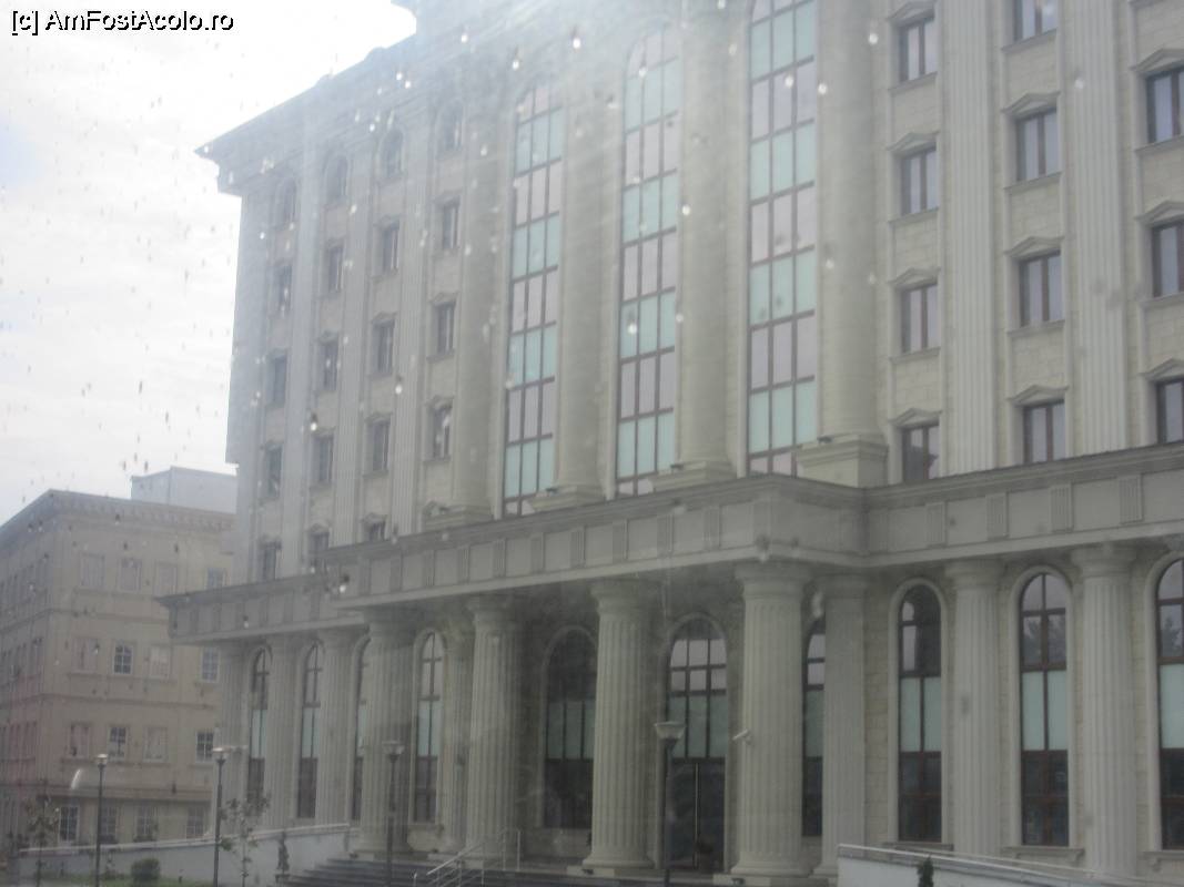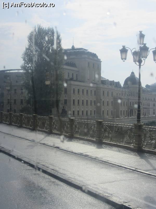 [P26] Clădire monumentală văzută pe geamul stropit de ploaie
