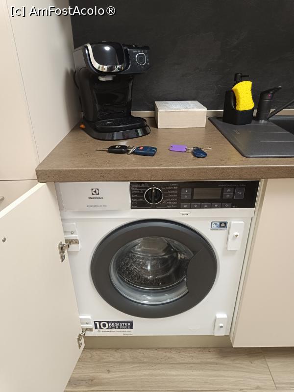 [P16] Cluj, Covaciu Aparthotel, Apartamentul 4, Camera multifuncțională, Bucătăria, Filtrul de cafea și Mașina de spălat rufe