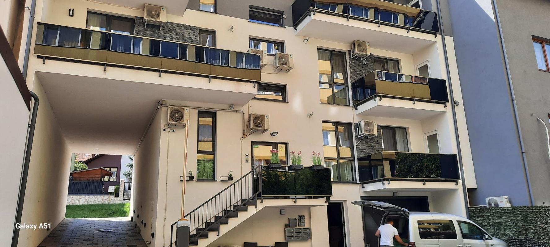 [P03] Cluj, Covaciu Aparthotel văzut din Curte, pe aceea scară se intră la cazare