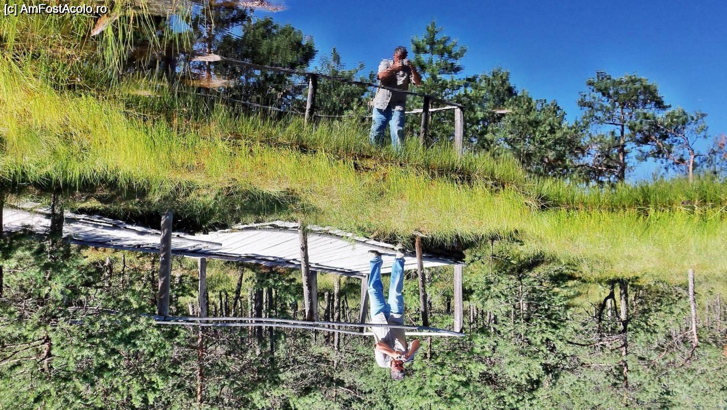 [P08] La capătul punții de lemn de lângă primul ochi de apă de pe traseu. Apa neagră și lipsa vântului permit oglindirea perfectă.