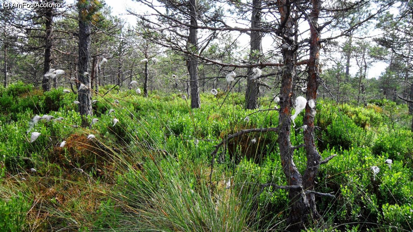 [P12] Planta numită bumbăcăriță (cu ”flori” albe, pufoase), printre puținele inofensive din tinov. Tufe de afin și pini piperniciți datorită condițiilor vitrege de mediu