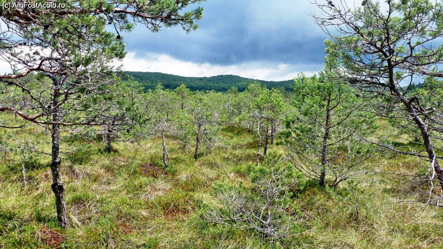 [P19] Peisaj din altă lume în mijlocul tinovului Mohoș. Sub noi se află un covor de turbă gros de 10-20 m care plutește pe apa vechiului lac. Datorită condițiilor extreme de mediu, pinii rămân piperniciți deși au aceeași vârstă (100 ani) ca arborii de pe margine.