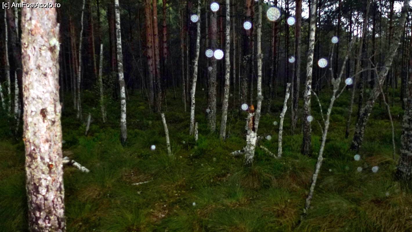 [P20] Peisaj paranormal în păduricea de mesteceni de la ieșirea din tinov. Nu e nimic deosebit, ci doar picături de ploaie care strălucesc în lumina blițului.
