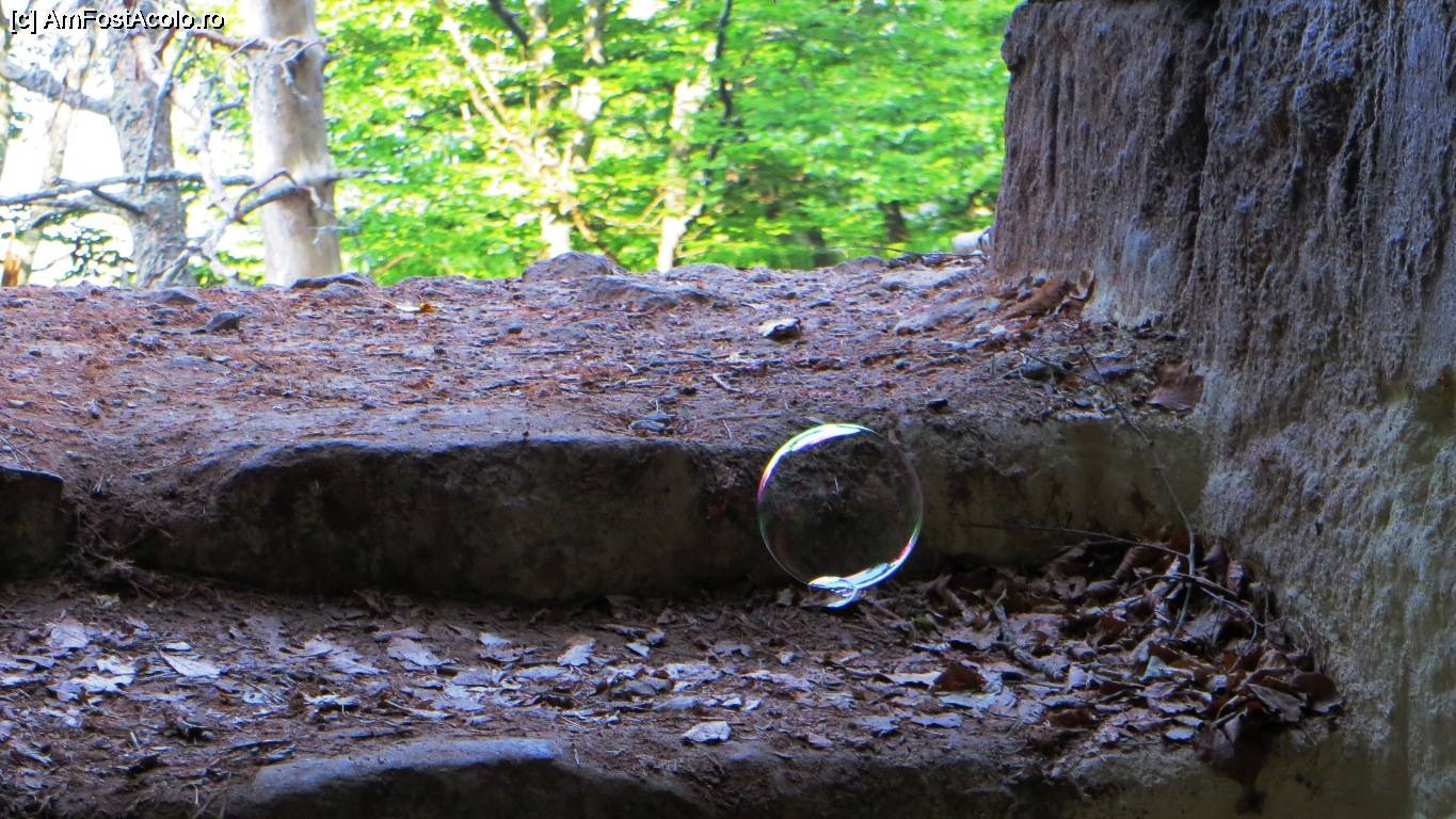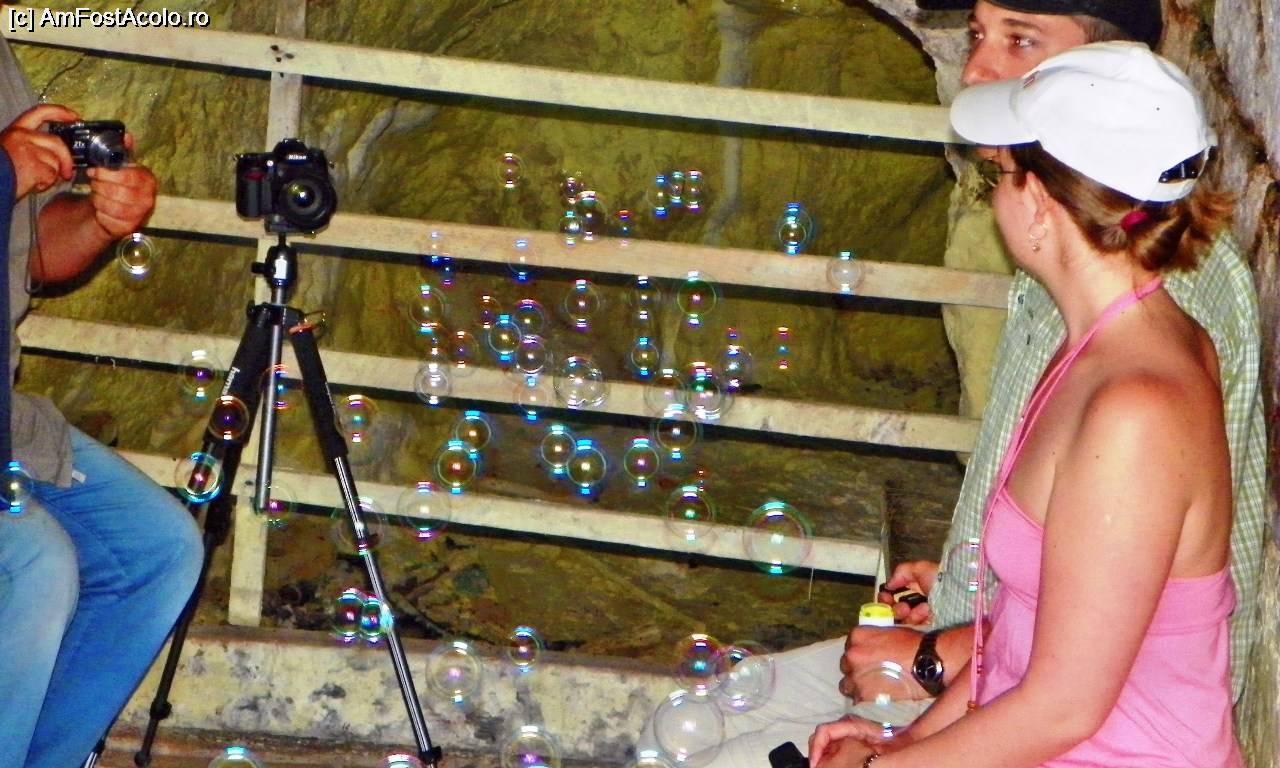 [P28] Experiment în Grota cu Sulf (Peștera Sulfatară). Balonul de săpun plutește la interfața gaz mofetic - aer, îndreptându-se agale spre ieșire