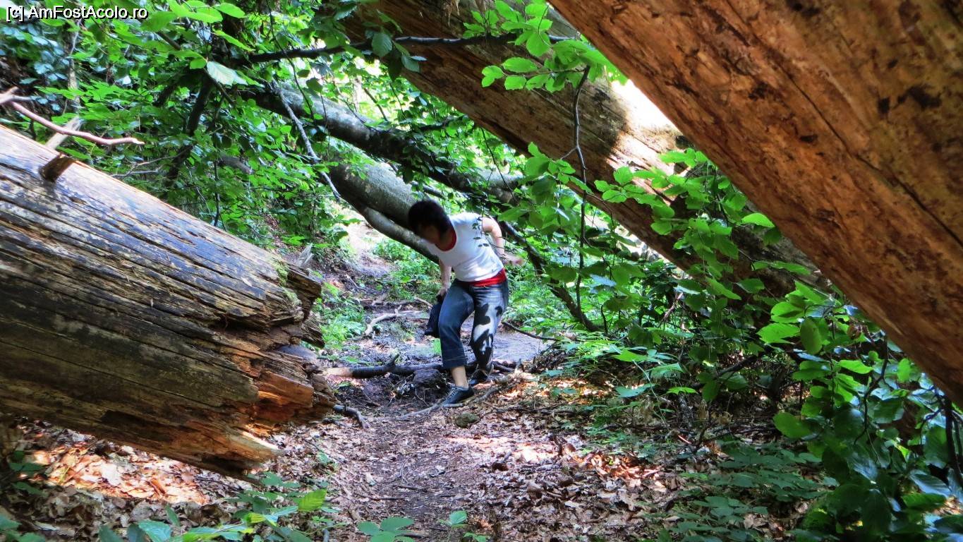 [P21] Turist cu casa în spinare pe un copac doborât care traversează cărarea înainte de Grota cu Sulf (Peștera Sulfatară)
