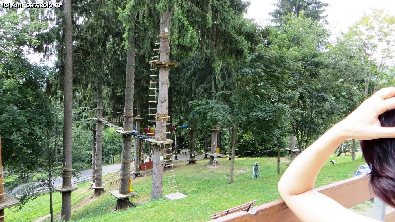 [P32] Parcul de aventuri de lângă Grand Hotel Balvanyos. Jos se vede drumul asfaltat (DN113), la stânga spre balvanyos, iar la dreapta spre Bixad. La stânga, cam 650 m, sunt Băile Apor. În spate vin urșii la mâncare și este și poteca bulină roșie spre capela catolică.