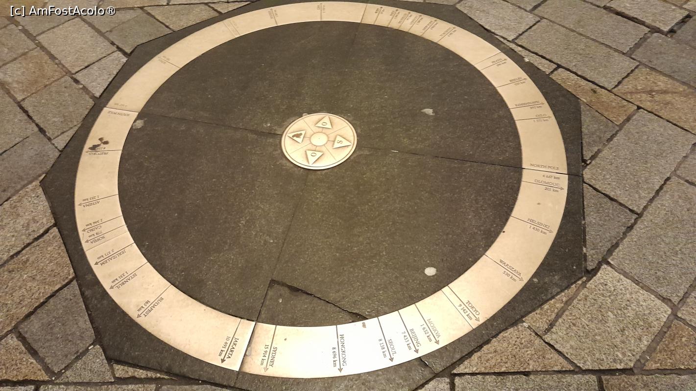 [P32] octogon din piatra ce are încastrat un cerc metalic pe care sunt trecute distantele pâna la capitalele importante ale lumii si chiar pâna la Polul Nord 4667 km